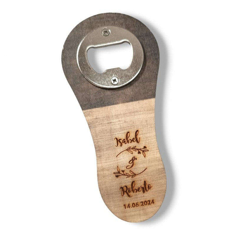 Abridor magnético fabricado en madera natural y de original acabado bicolor con grabación de vuestros nombres y fecha, un detalle original y práctico para tus invitados!!