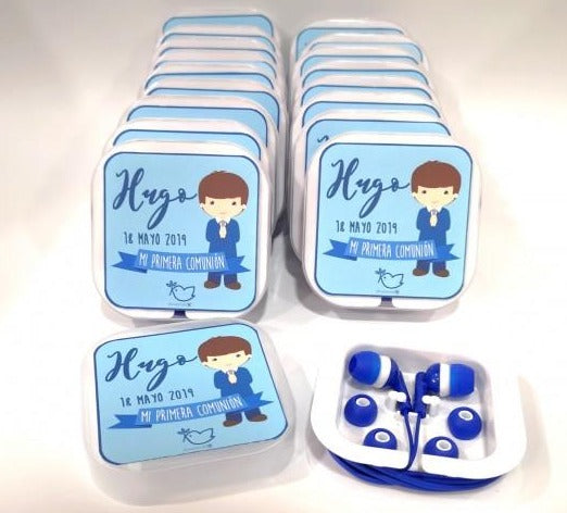 Auriculares personalizados para comuniones y otros tipos de enveot. Presentados en caja de pvc. con etiqueta personalizable