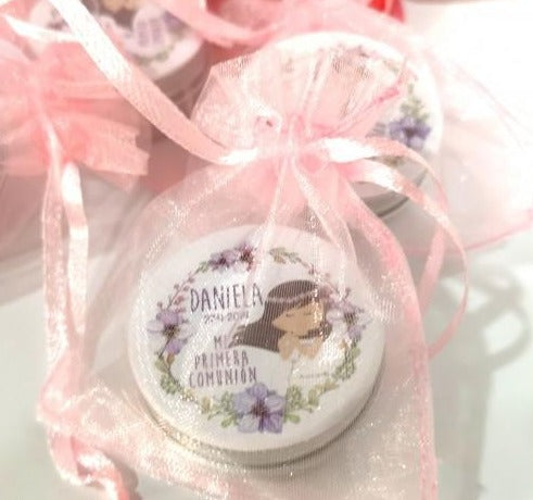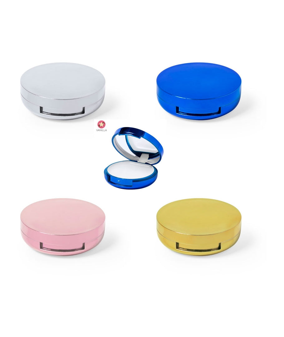 Bálsamo labial con espejo integrado en elegantes colores brillantes. Aroma vainilla, con protección SPF15 y dermatológicamente testado. Medidas: 4cm de diámetro. Posibilidad de presentar con una pegatina personalizable para el evento, pregunte por precio adicional.