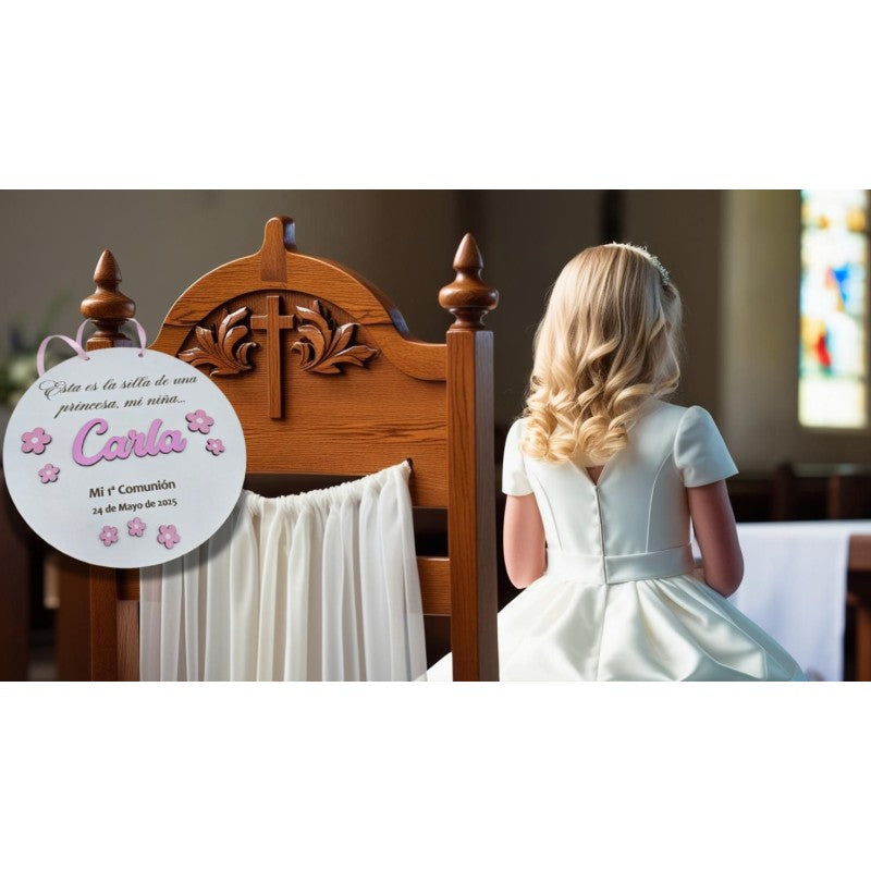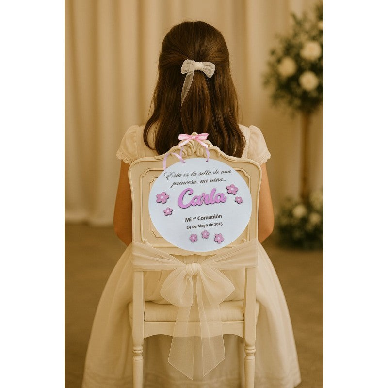 Dale un toque especial a la celebración de la Primera Comunión con nuestros exclusivos carteles para sillas. Disponibles en forma redonda o rectangular y con una medida de 30 cm, estos carteles personalizados son ideales para colocar en la silla del protagonista del evento.