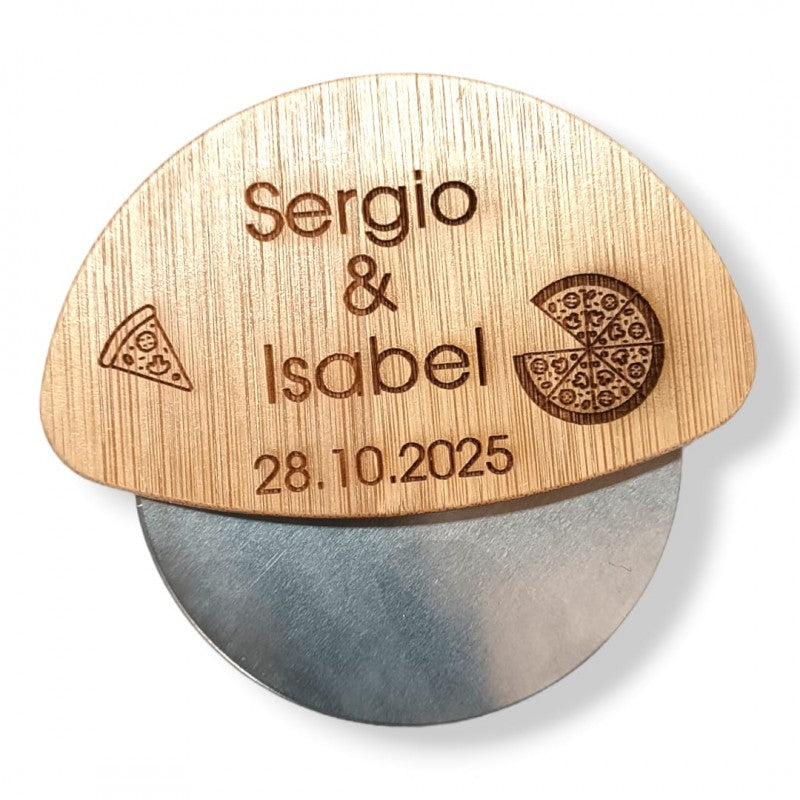 Cortapizzas de bambú personalizado con grabación de vuestros nombres y fecha, un regalo para tus invitados ideal para tener siempre a mano en casa!