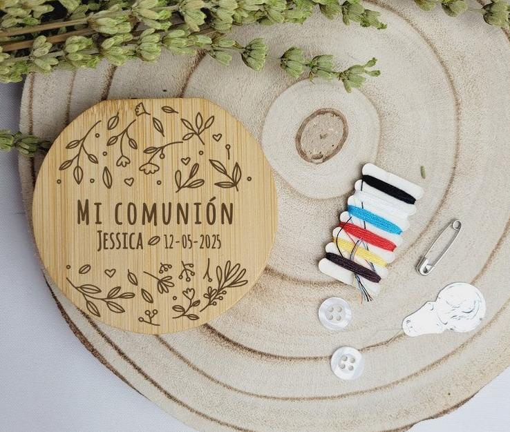 Práctico set de costura, presentado en estuche de bambú, con espejo interior y cierre magnético. Contenido: 2 agujas. Hilo en 6 colores diferentes. 2 botones. 1 imperdible. 1 enhebrador.