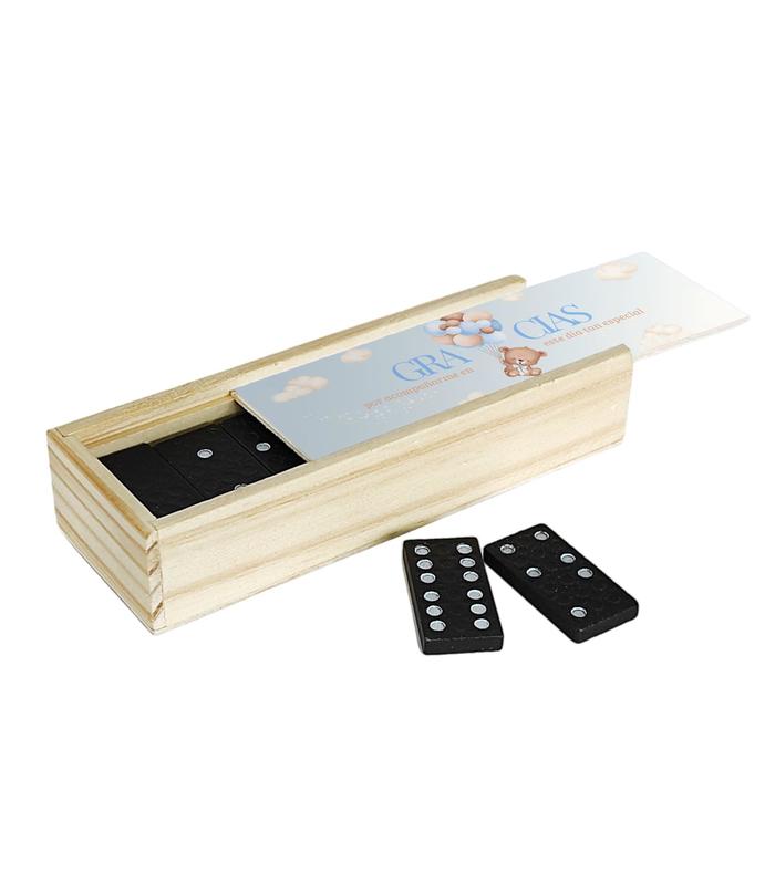 Divertido dominó con piezas en color negro , en caja de madera. Con 28 piezas de madera y presentado en estuche de madera con tapa. Tapa personalizada con pegatina.