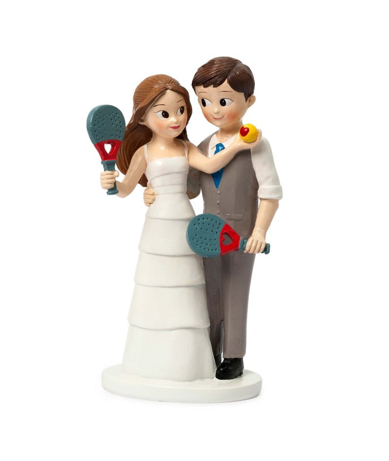 Preciosa figura de boda para decorar la tarta el día del enlace. Diseño moderno y juvenil en el que los novios están listos para ir a jugar al pádel. Es una figura perfecta para parejas deportistas aficionadas al pádel o tenis. Una bonita figura de pastel para decorar la tarta en el restaurante en día del enlace y también para regalar a las parejas que se van a casar en un futuro. Para evitar el contacto directo de la figura decorativa con la tarta se recomienda poner una oblea o capa de fondant y retirarla antes de servir.