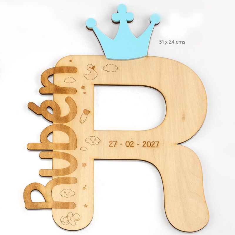 Inicial de madera con el nombre del Bebé en el lateral izquierdo, decorado con una corona de color celeste. Para recuerdo de un bautizo, nacimiento o cumpleaños. Ideales para la decoración del dormitorio infantil o la puerta de la habitación. Personalizado con el nombre y la fecha del evento.