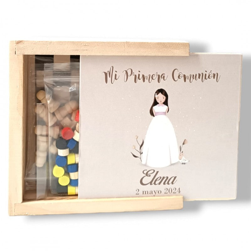 JUEGO PARCHIS, DAMAS Y AJEDREZ EN CAJA CON PEGATINA COMUNIÓN NIÑA