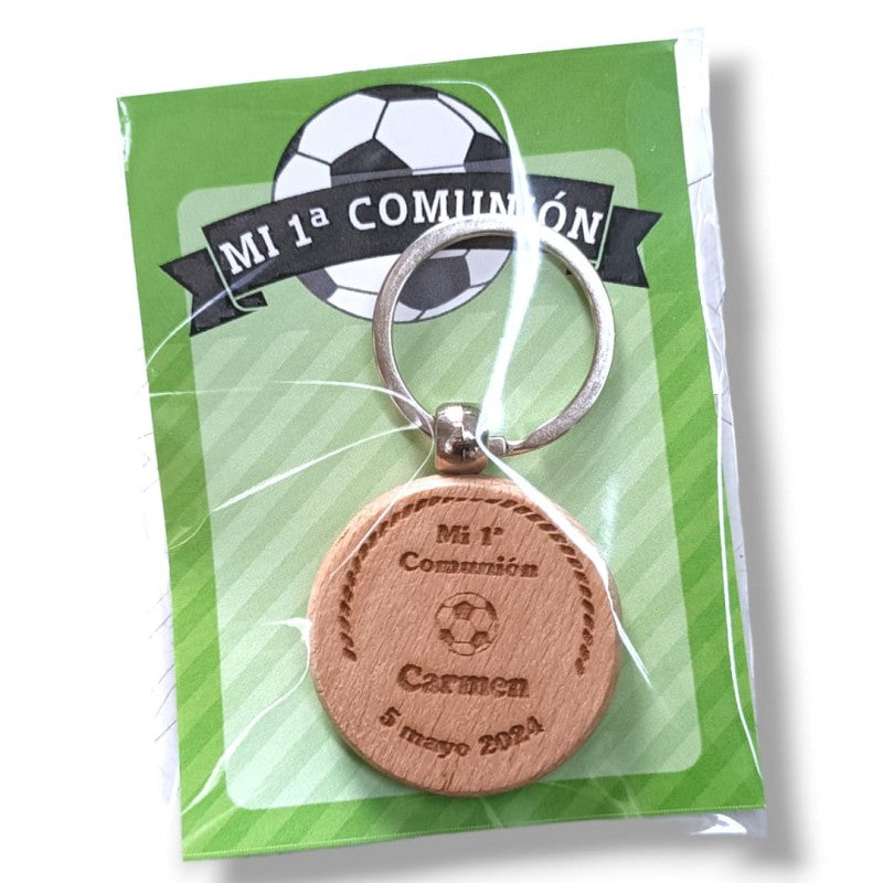 Llavero de madera para comunión personalizado con su nombre y fecha. Incluye grabación y decoración con tarjeta de motivos fútbol en color verde y bolsita de celofán.