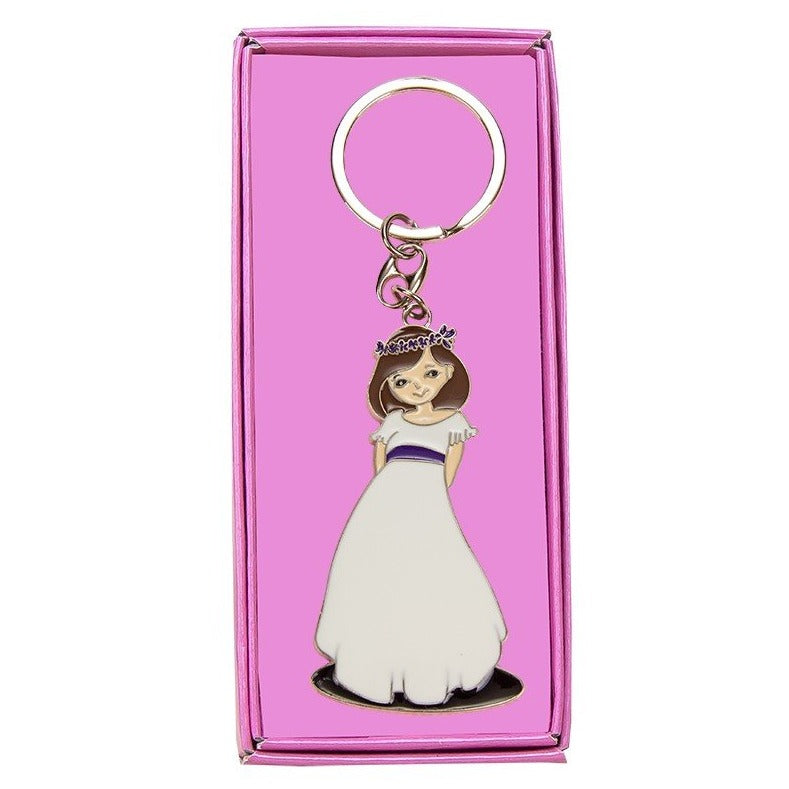 Bonitos llaveros con el diseño de una bonita niña que luce su vestido de comunión en color blanco con un toque de color púrpura de su lazo.
