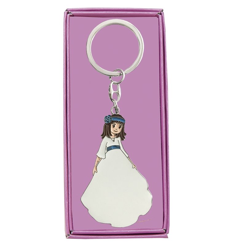 Estos llaveros tienen la forma de una niña luciendo un precioso vestido de comunión en color blanco con detalles en color verde.