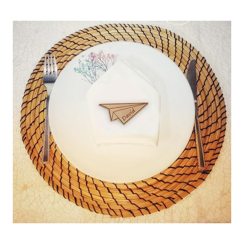 Marcasitios con forma de original avión de madera, con imán trasero o sin imán, un bonito detalle para que tus invitados puedan conservar un precioso recuerdo y tener sus nombres personalizados en casa, Los marcasitios están realizados en madera de 3 mm de grosor,medidas aprox 6x5.5 cm. Pedido mínimo 10 uds. No se admiten devoluciones de es artículo.