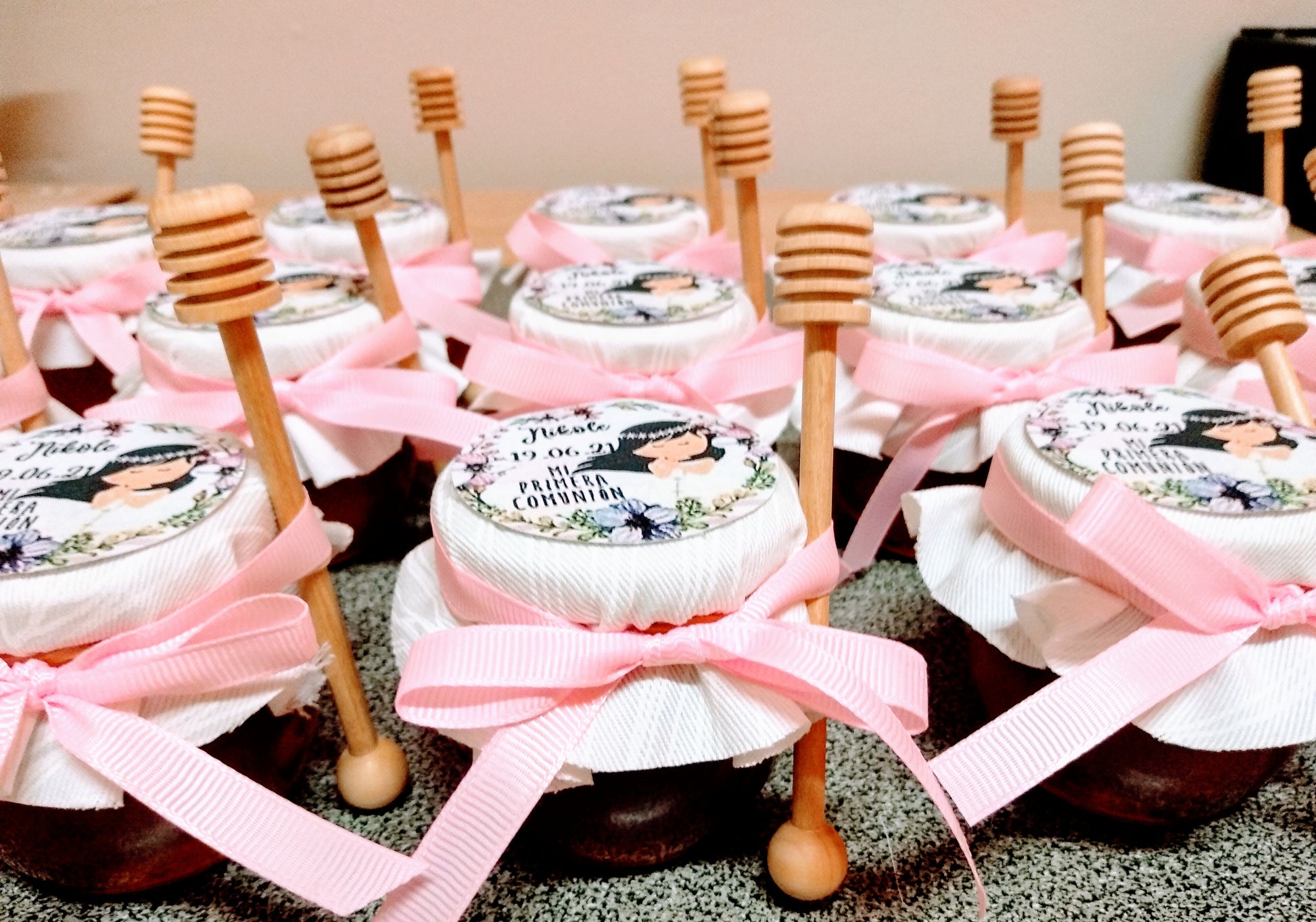 Miel artesana hecha de forma tradicional de mil flores. Tarro de cristal con tela, lazo y pegatina personalizada. Cuchara de madera opcional.