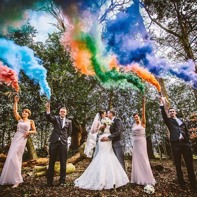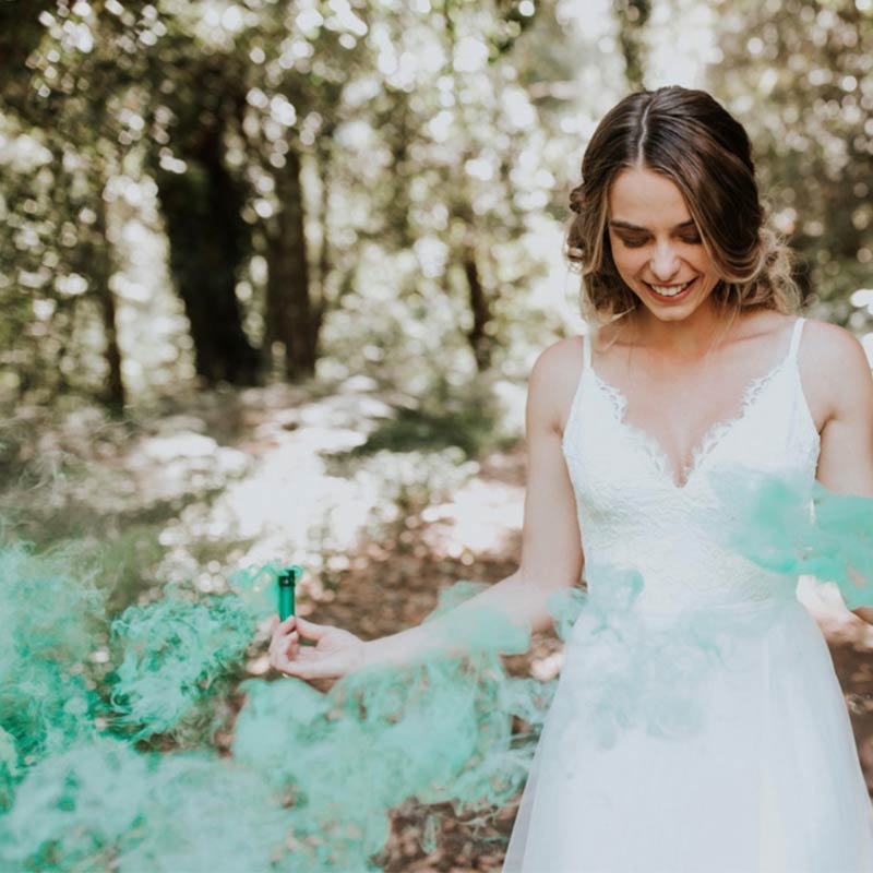 Con estas antorchas de humo puedes crear increíbles efectos para las fotografías de tu boda. Este pack de antorchas se vende en 5 colores: verde, amarillo, azul, rojo y naranja. Dura 60 segundos, lo suficiente para crear momentos únicos. Se pueden coger con la mano y son de baja peligrosidad. El propio humo de la antorcha no mancha la ropa.