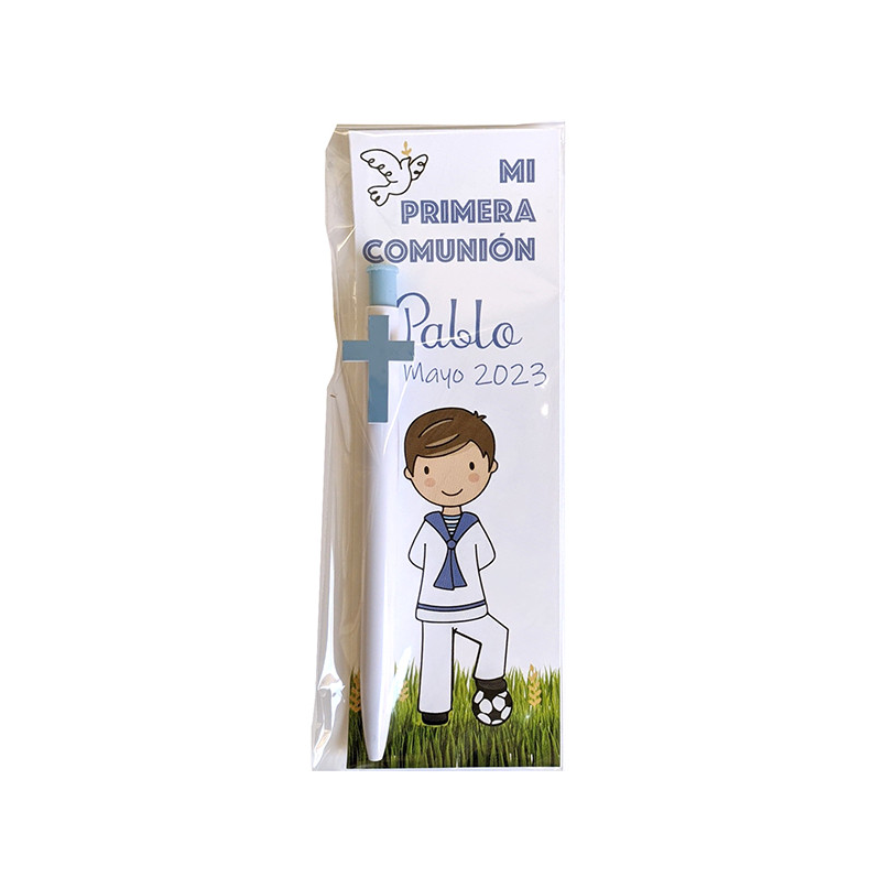Original pack para tus invitados, perfecto como detalle de comunión y también como agradecimiento para colocar en el plato de cada comensal. El pack consta de marcapáginas y bolígrafo con detalle de cruz en el clip. Presentado en bolsita de celofán transparente, listo para entregar!