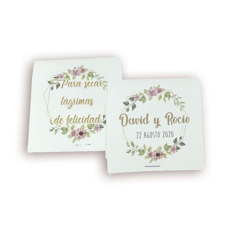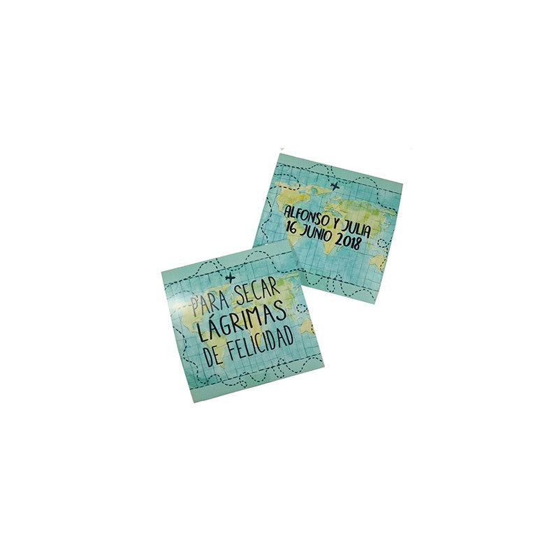 El pañuelo de felicidad incluye un pañuelo de papel en su interior, y lleva impresos vuestros nombres y fecha de boda en una cara, y en la otra la frase: Para secar lágrimas de felicidad. Interior blanco, exterior con diseño mapamundi. Además disponible también la opción de compra de conos, paipáis, bengalas....todo a juego y personalizado!