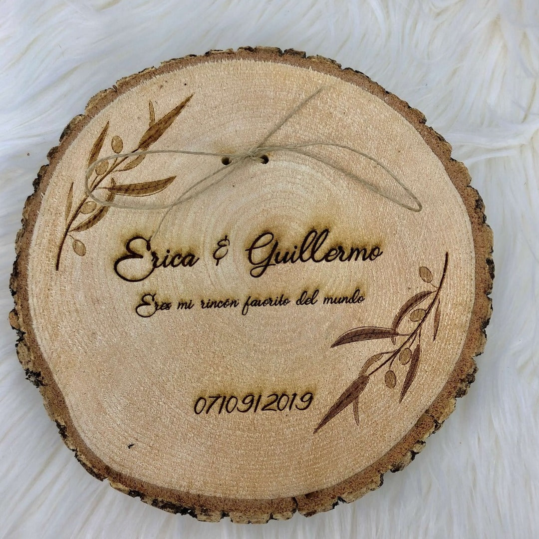 Con este porta alianzas de madera natural con forma de rodaja podrás llevar los anillos de tu boda. Recién cortadas, son naturales, sin ningún tipo de tratamiento. Son ideales para personalizarlos a tu gusto, cuyo grabado se hace con láser y harán que resalten las fotos.