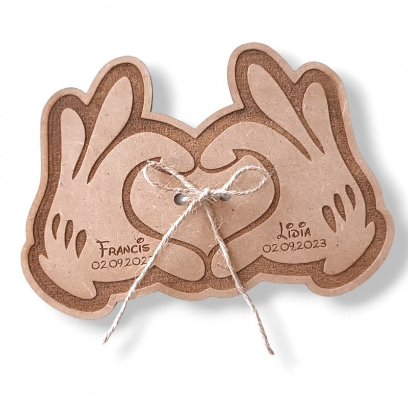 Realizado en madera de okume con una elegante forma de manitas como Mickey y Minnie, las alianzas van en la cuerdecita.