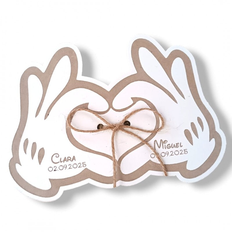 Realizado en madera de okume con la parte delantera blanca, la parte trasera es color natural, con una elegante forma de manitas como Mickey y Minnie, las alianzas van en la cuerdecita.