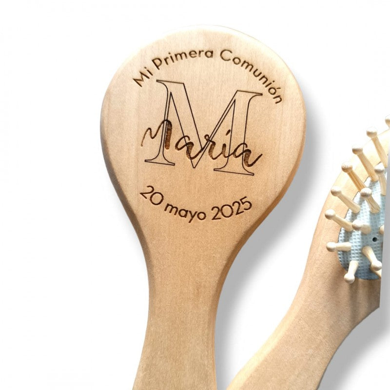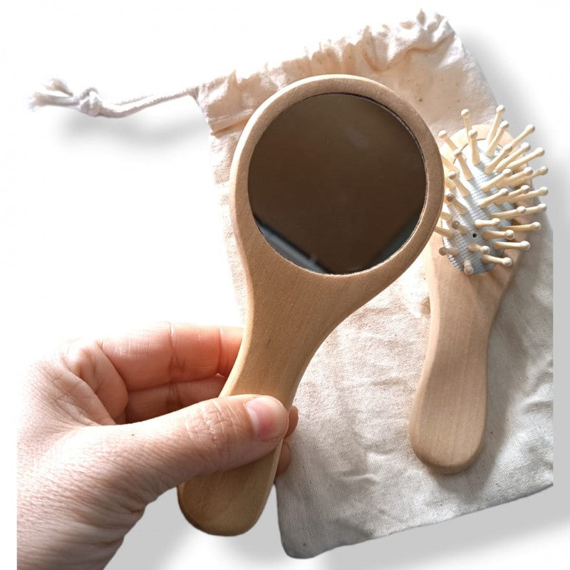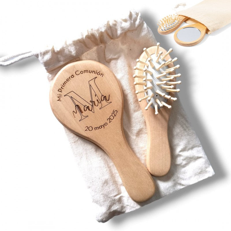 Fabricados en madera natural. Presentados en funda 100% algodón, con cierre de cordón. Sólo va grabado el espejo, el cepillo no lleva grabación.