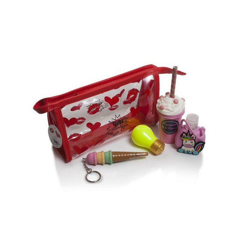 Set Girl Power Con Neceser Transparente, Sacapuntas Y Gel Limpiador Boligrafo, Rotulador Fluerescente, Lapiz