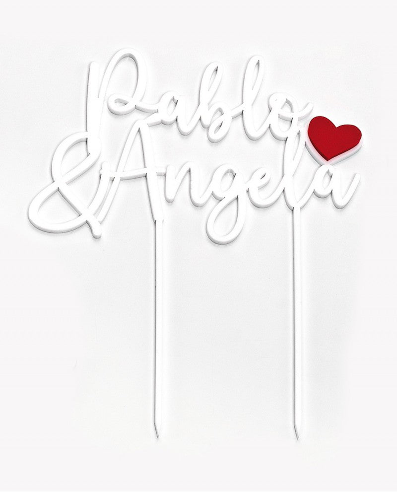 Preciosa decoración para la tarta color blanco. Un detalle para la tarta con el nombre de los novios y un bonito corazón rojo en un lateral. Una decoración completamente distinta, acorde con tu gusto y personalidad. Si no te gustan las "típicas" figuras de tarta, esta es la decoración perfecta.