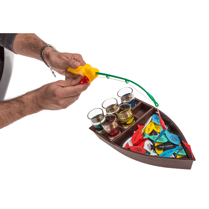 Incluye una caña de pescar, 24 peces, 6 vasos de chupito de cristal, así como un barco; embalaje: en caja de regalo